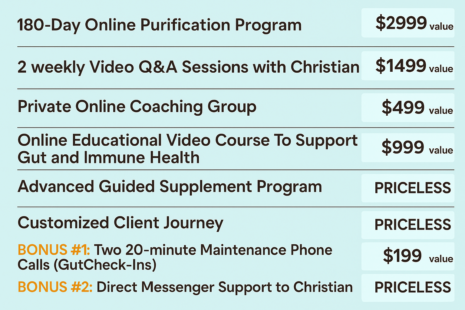 The Purification and Health Transformation Program is a 6-month+ journey focused on opening detoxification pathways, improving cellular health, and healing gut imbalances while safely and efficiently clearing overgrowths.